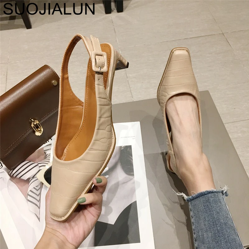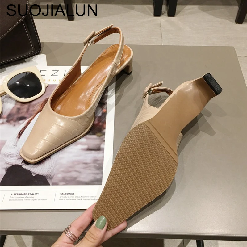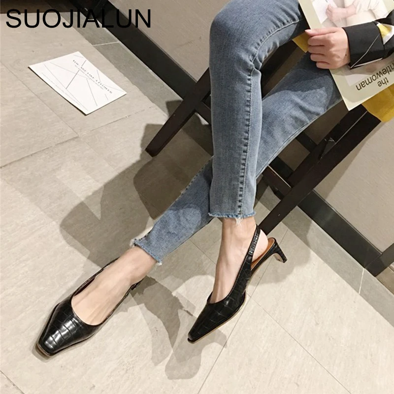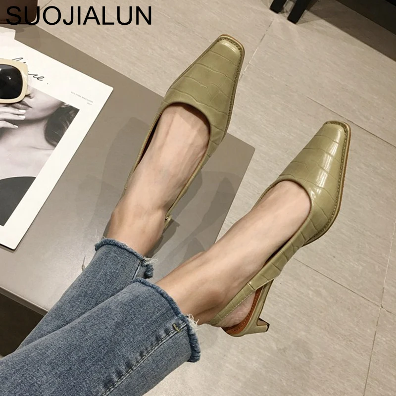 Hot Discount SUOJIALUN 2020 Spring Women Sandal Pump Med Heel OL Valentine Shoes Ladies Square Toe Slip On Elega